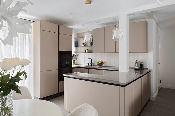 Г-образные кухни особенно хорошо подходят семьям, в которых традиционно готовкой любят заниматься несколько человек одновременно. Также такие кухни дают возможность установить дополнительную рабочую поверхность, например, барную стойку или компактный обеденный стол. Как итог, пространство становится более универсальным.