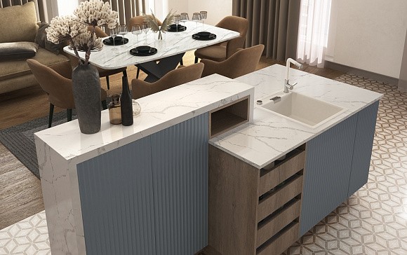 Эстетика — не единственный бонус острова. Он выступает в роли логичной линии зонирования, отделяя зону кухни от гостиной. Важно, чтобы вокруг острова оставалось достаточно места для свободного перемещения — минимум 90 см. Также заранее определите, какие функции будут интегрированы в остров: варочная панель, мойка, духовой шкаф и т.д., чтобы подвести к нему коммуникации и электрику.