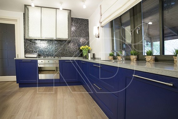 Темные оттенки синего наиболее уместны в стилях хай-тек и модернизм. Присутствие хромированных элементов и глянцевых поверхностей раскрывают возможности цвета, подчеркивают его глубину и выразительность. Прекрасно будет смотреться классический гарнитур с фасадами лазурного или кобальтового оттенка. Презентабельности такой мебели добавляют позолоченные ручки, резьба, рамки. Нельзя забывать о том, насколько выразительно выглядят синие кухни в интерьере, оформленном в стиле прованс. При этом мебель лучше выбрать в бирюзовых или васильковых тонах. Растения на подоконниках, льняные шторы и скатерти подчеркнут нежность и красоту этих оттенков.