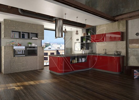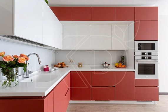 Стильная кухня с красно-белыми фасадами