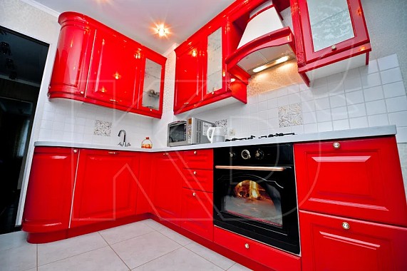 2. Разнообразие вариантов оформления. В красных и белых тонах можно оформить фасады совершенно разными способами. Например, сделать яркими верхние шкафчики, а нижние оставить нейтральными. Или, например, расположить цвета в чередующемся порядке – для этого понадобится параллельно расположенные шкафы в разных цветах.