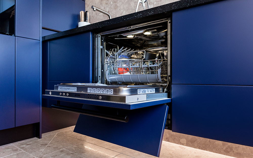 - Насыщенный синий оттенок и матовые поверхности. За счет этого мебель выглядит благородно и дорого.