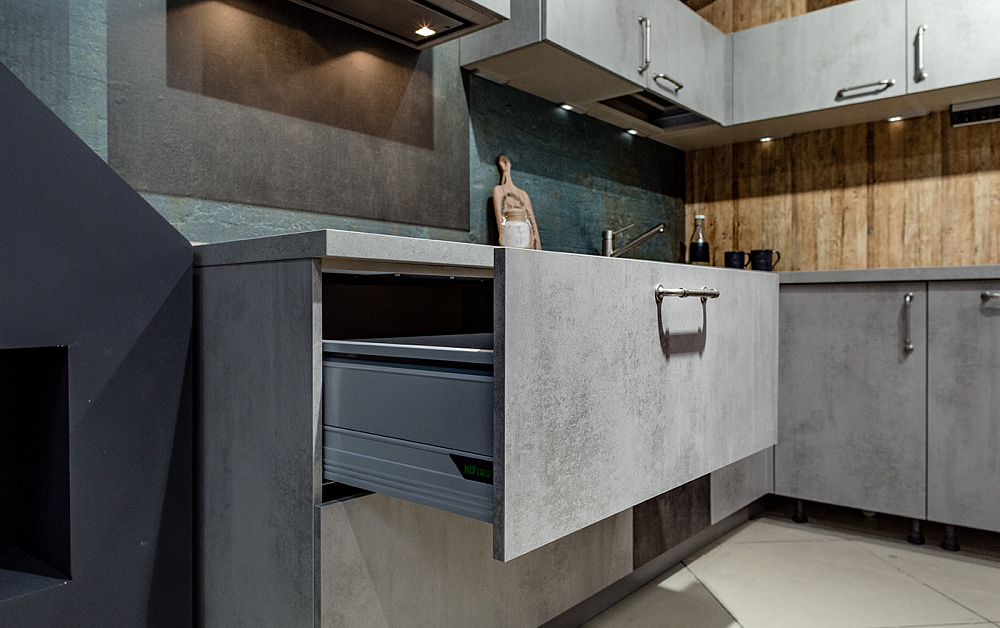 В образе новой модели "Стоун" дизайнеры воссоздали образ фундаментального уюта. Здесь есть все, что дарит ощущение абсолютного комфорта: фактура, цвет, форма и расстановка кухонных элементов. Материалы фасадов выполнены из новейшего современного материала, имитирующего фактуру бетона и ржавого металла - отсюда и характерное название гарнитура. Угловая кухня с островом "Стоун" привносит в интерьер черты популярного урбанистического стиля, который приветствует такие материалы, как бетон, металл, стекло. Цветовое решение гарнитура выбрано в соответствии с основными тенденциями промышленного дизайна: сочетание светлого и темного тонов открытых полочек и закрытых верхних фасадов образует игру контрастов и грамотно расставляет стилевые акценты.