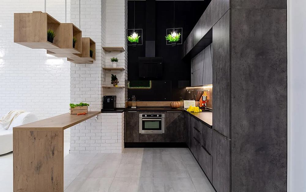 Особенно броско будет смотреться угловая кухня с островом. Ее центральный элемент словно обрамляется фасадами, а потому органично вписывается в общую композицию. Если при этом выбрать для фасадов сдержанные цвета, кухня обретет благородный, почти кинематографический облик.
