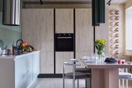 Поверхности не просто схожи, а связаны между собой чёрным цветом. На потолке в нём выполнены софиты, а на кухне – цоколь и профили системы «Space Line». Это та самая система открывания фасадов без ручек, которая делает поверхности гарнитура максимально объемными и выразительными! Кстати, тёмные элементы здесь присутствуют не только снаружи. Всё внутреннее пространство пенальной группы также выполнено в стильном чёрном цвете. Пеналы оснащены удобными аксессуарами для хранения продуктов и утвари, а также встроенным холодильником и духовым шкафом на удобной высоте.